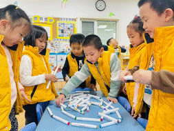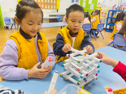 孩子们放开手用笔进行创意搭建,让我们来看看谁的笔塔,搭建得又高又稳吧!