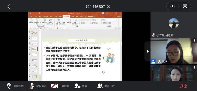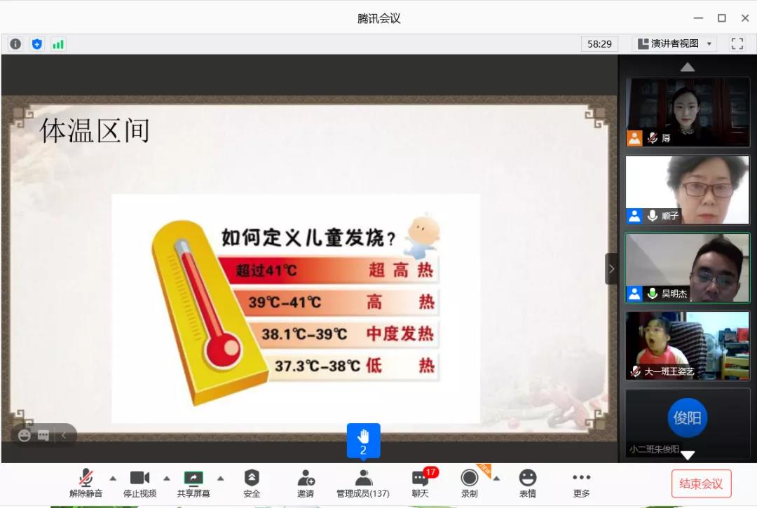 为不断提升、创新家园共育能力,帮助家长树立科学育儿观,2020年11月29日上午,燕山幼儿园开展了“家园共育、助力成长”科学育儿知识讲座。这次讲座邀请了中国中医针灸协会委员、山东省妇幼保健协会委员吴明杰医师,山东省精神卫生中心、儿童青少年心理行为科主治医师陈洁。本次活动采用了腾讯会议进行线上直播。