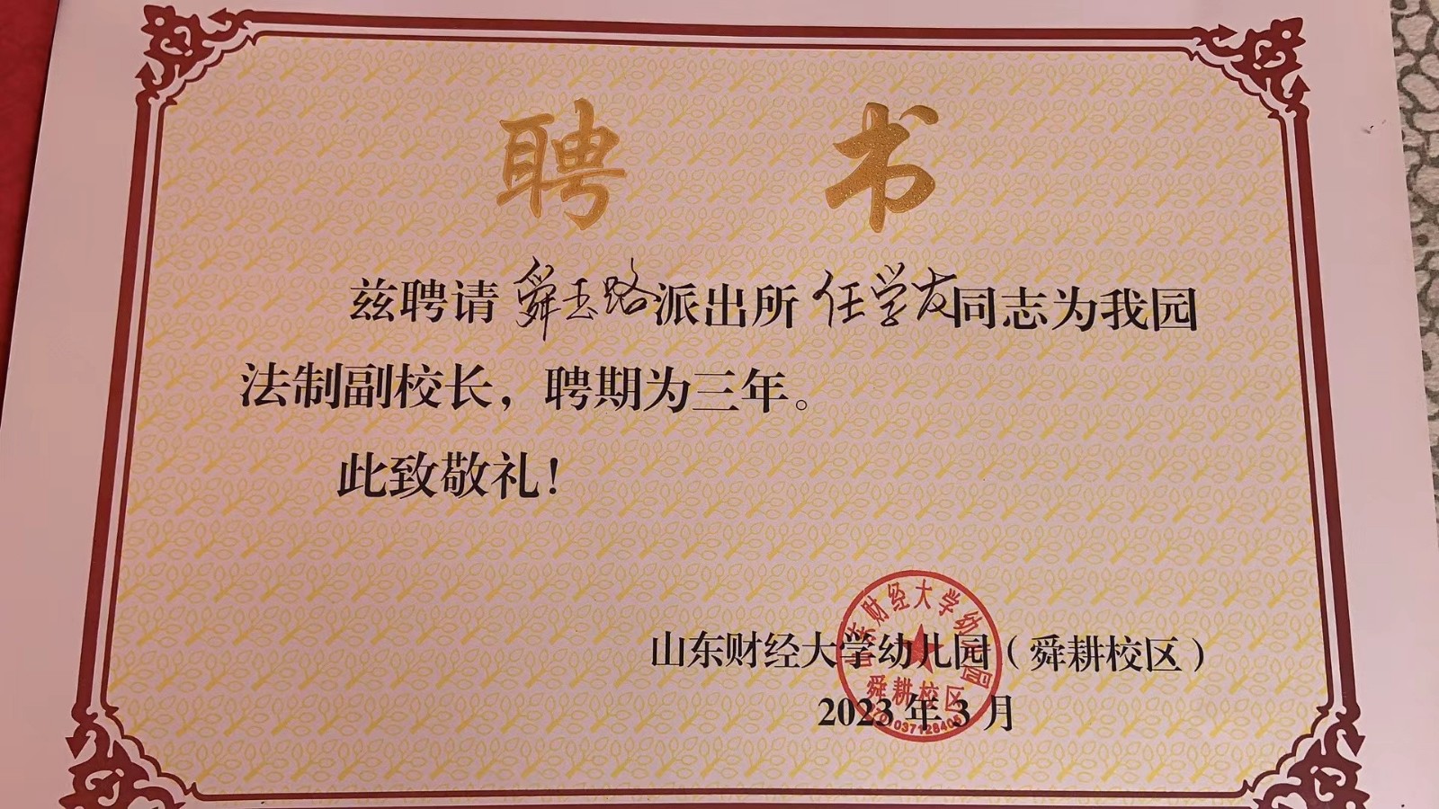 为加强少年儿童法制教育,动员社会各方力量关心少年儿童的健康成长,预防和减少少年儿童违法犯法,根据《中华人民共和国预防未成年人犯法法》、《中小学幼儿园安全管理办法》和其他法律法规的规定,现聘请舜玉路派出所警官任学友同志担当我园的法制副校长,将不定期地对幼儿园教职员工进行法制安全宣传教育,保护未成年人的就学环境,加强校园安全人人有责。