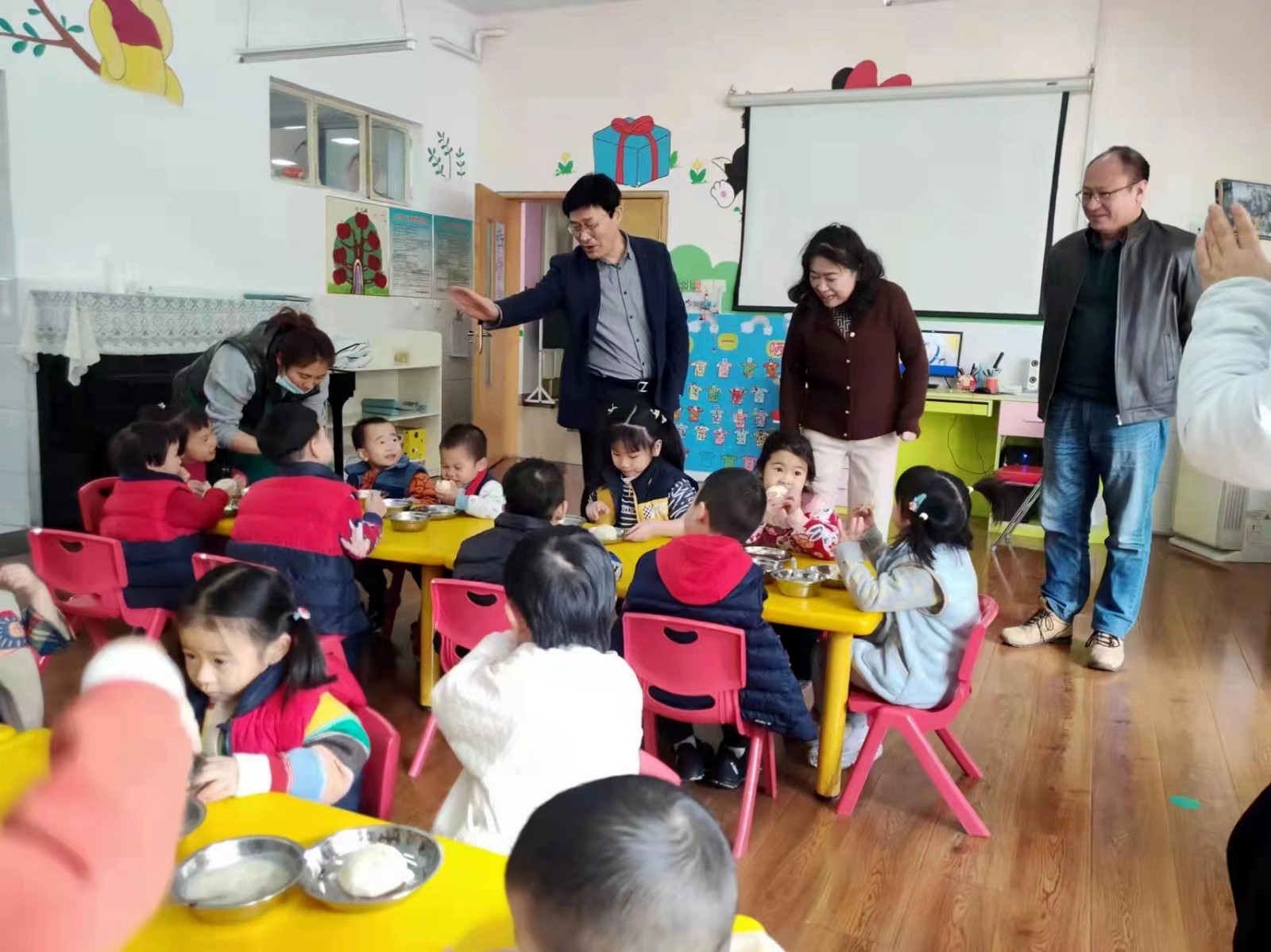 鲁处长俯下身子亲切地询问孩子们:“包子好吃吗?什么馅的?你吃了几个啊?”孩子们大方地打着招呼:“客人老师好!”并争先恐后地回答着:“是肉包、很好吃、我吃了两个啦、我刚吃了一个……”