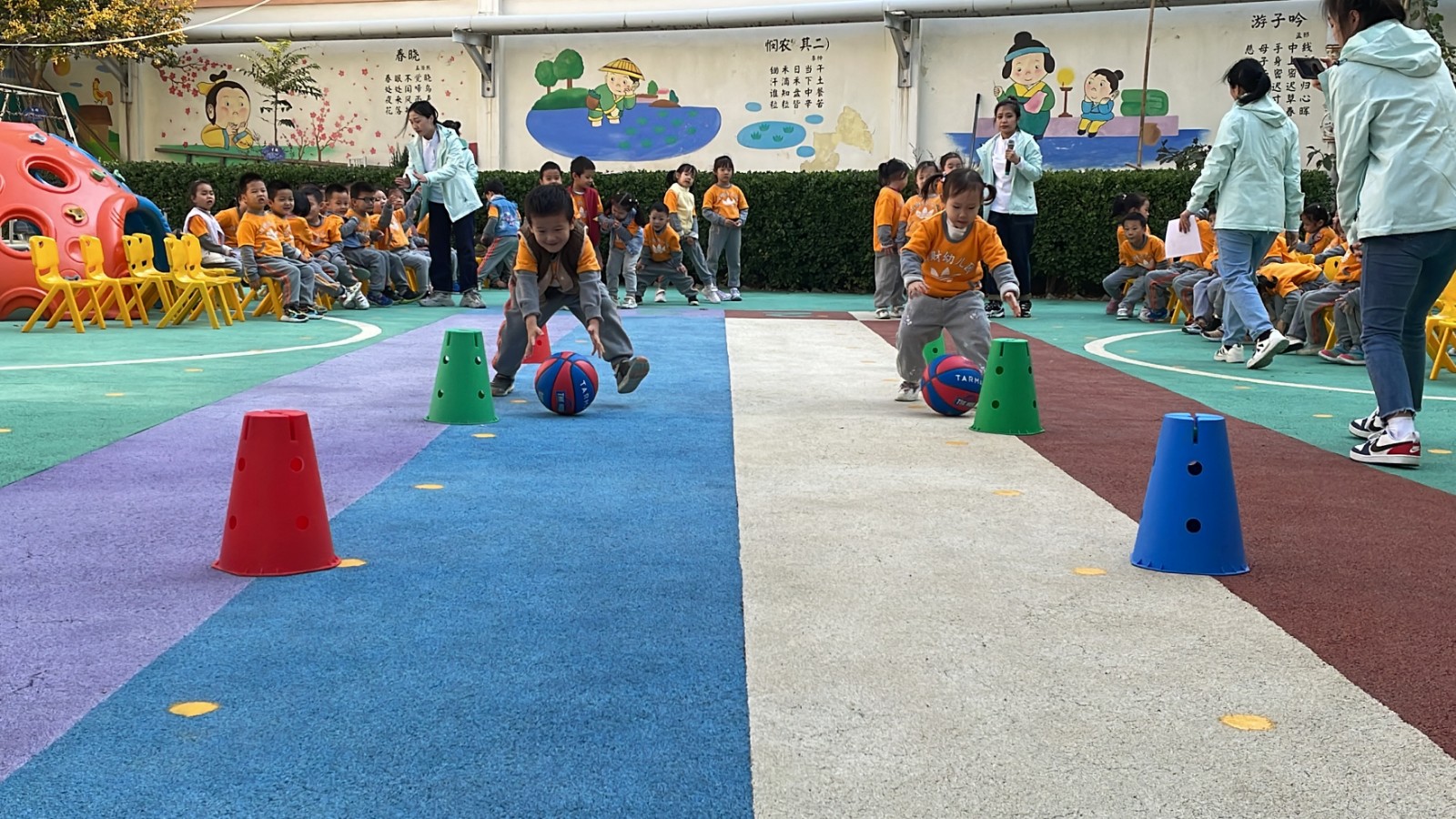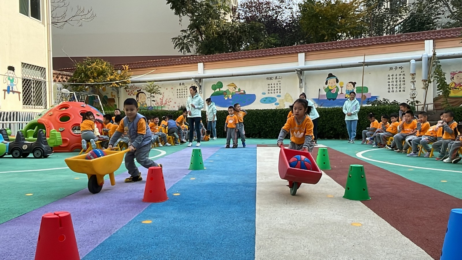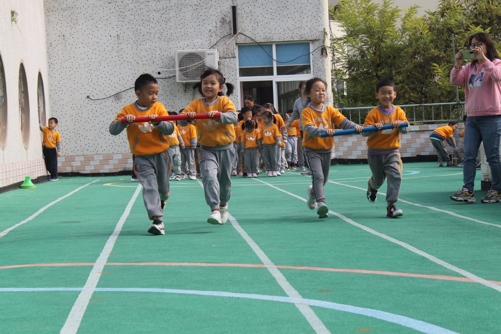 我们老师们精心设计了“小动物摘果果”、“闯关我最棒”、“炸碉堡”、“火车跑得快”、“极速前进”、“花样篮球”、“运西瓜”、“翻山越岭”、“踩石过河”、“旋风跑”、“全能小将”等适合各个年龄阶段孩子们的运动游戏,三个分会场的活动把运动会推向了最精彩的部分,孩子们充分发挥着自己学到的本领,将走、跑、跳、钻、爬、平衡等动作技能方面完美的结合起来,进行了多样化的锻炼并逐步做到了快速、准确、有力、灵活、协调,各种基本运动技能得到了充分的展现和发挥,通过和小伙伴们的合作赢得优秀的成绩,每个参与游戏活动的小朋友都是小脸红红的、汗津津的、情绪高涨大声地和身边的同伴们分享着她的收获和快乐,充分体验到集体合作的温暖和幸福,培养了孩子们团结合作意识和集体荣誉感、自豪感。