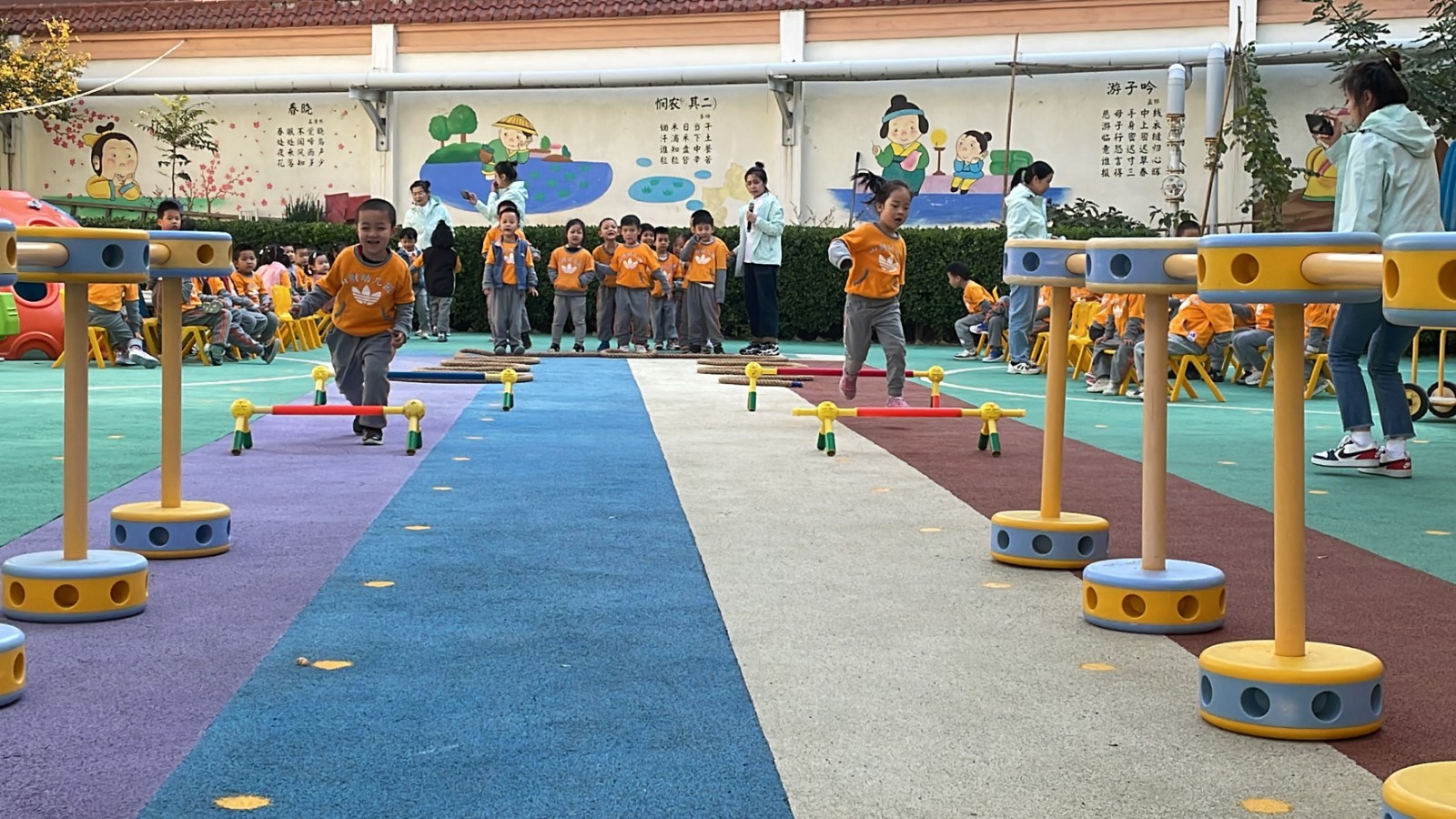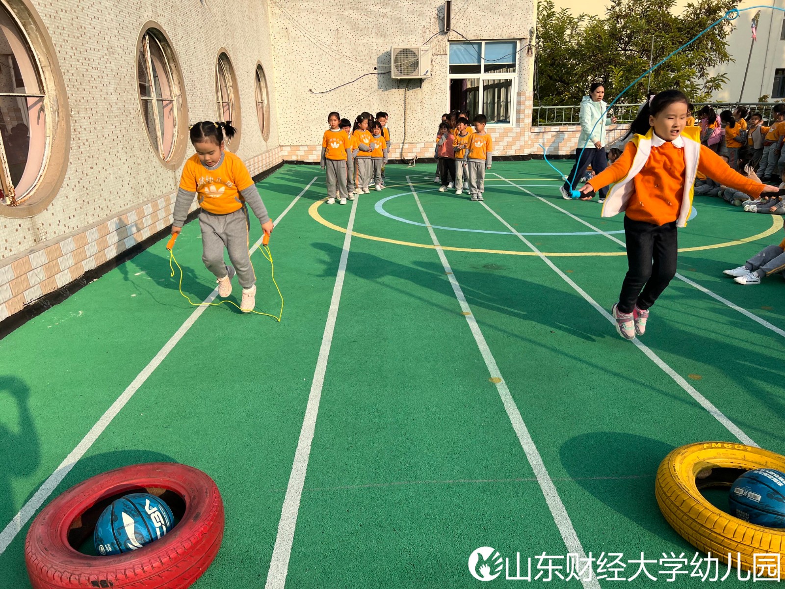 班级教师们精彩的跳绳表演将整个开幕式会场的气氛烘托了起来,只见她们灵动美丽的身姿格外矫健,双脚快速地交替着像是在琴键上跳舞的音符,孩子们的欢呼声、呐喊声此起彼伏,她们使劲地挥动着自己手中的 “加油小手掌”为老师们加油鼓劲并且都认为自己班级的老师获得了“冠军”,可爱极了!“维尼熊”也激动的和小朋友们击掌,给老师们点赞呢!