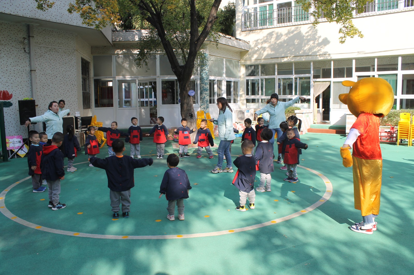 小朋友们高兴地和维尼熊打着招呼,维尼熊也随着音乐声响起,加入了小、中、大各级部孩子们的体操展示——小班宝宝们萌动乖巧的样子、中班小哥哥姐姐们执着认真的表情、大班大哥哥姐姐们整齐划一的动作,无不体现出她们健康活泼、积极向上的精神风貌,童真、童趣、童心,让我们拿出爱心呵护她们茁壮成长,一起运动、锻炼身体吧!