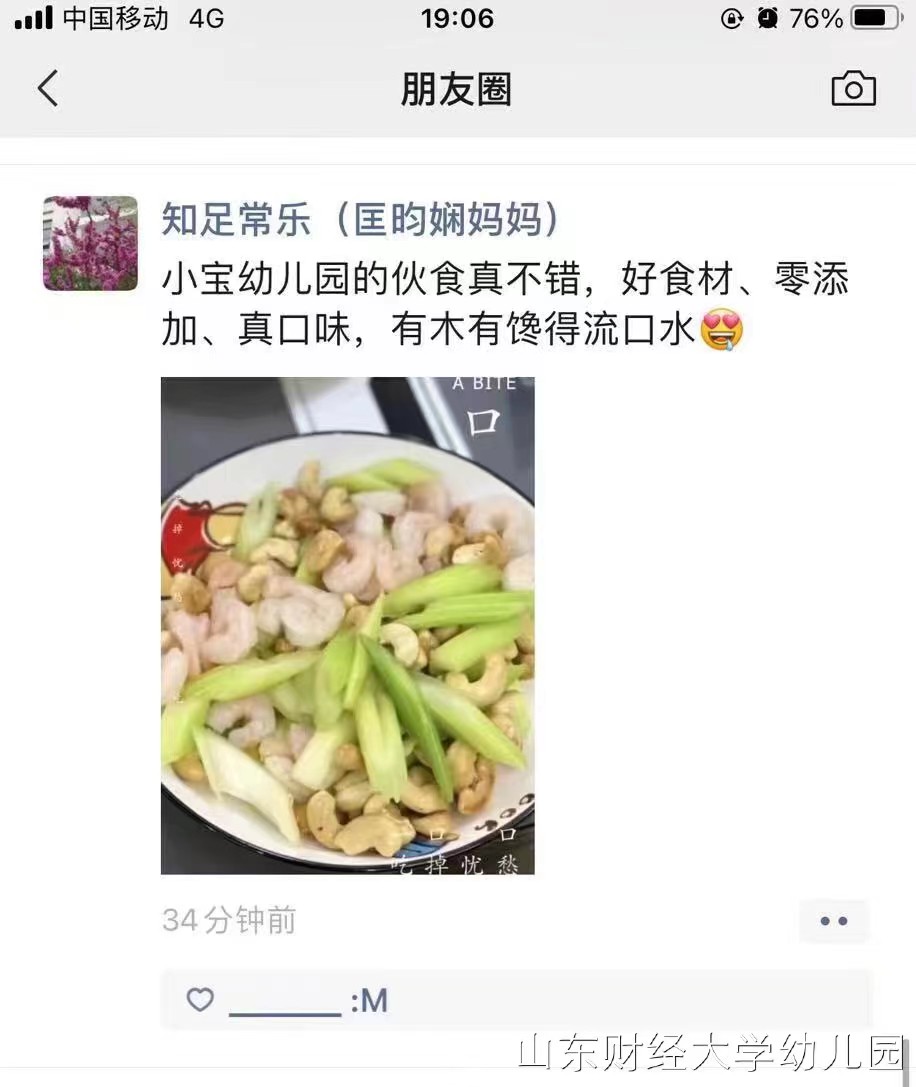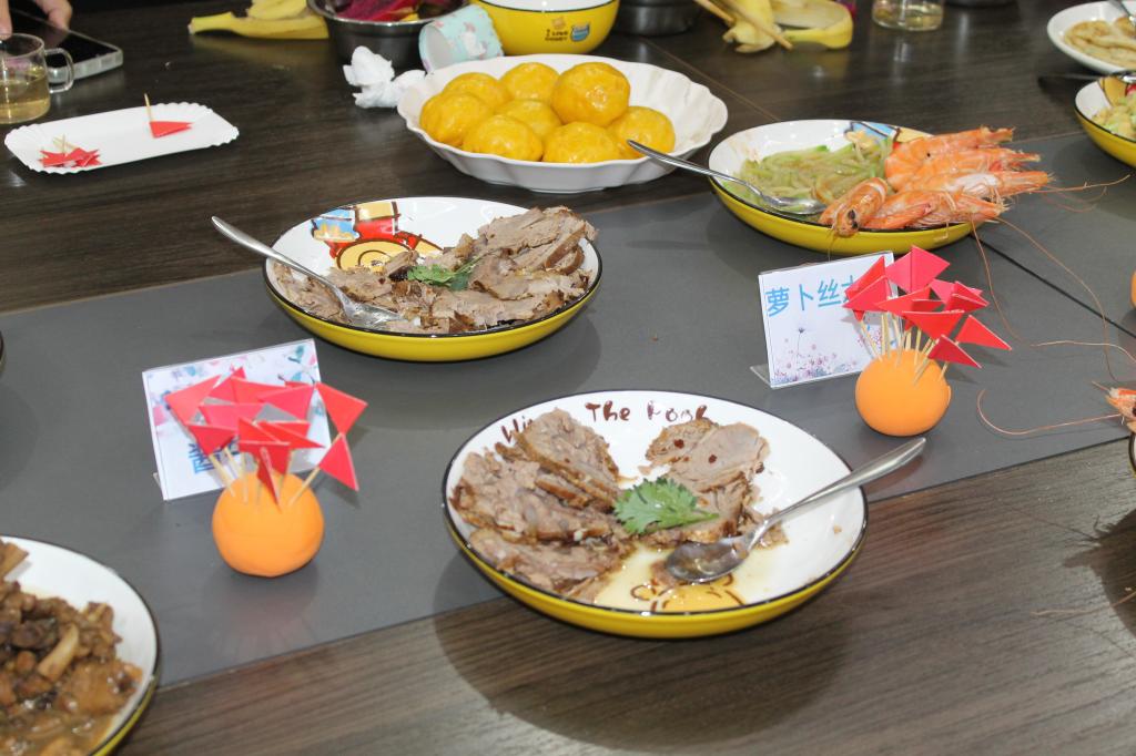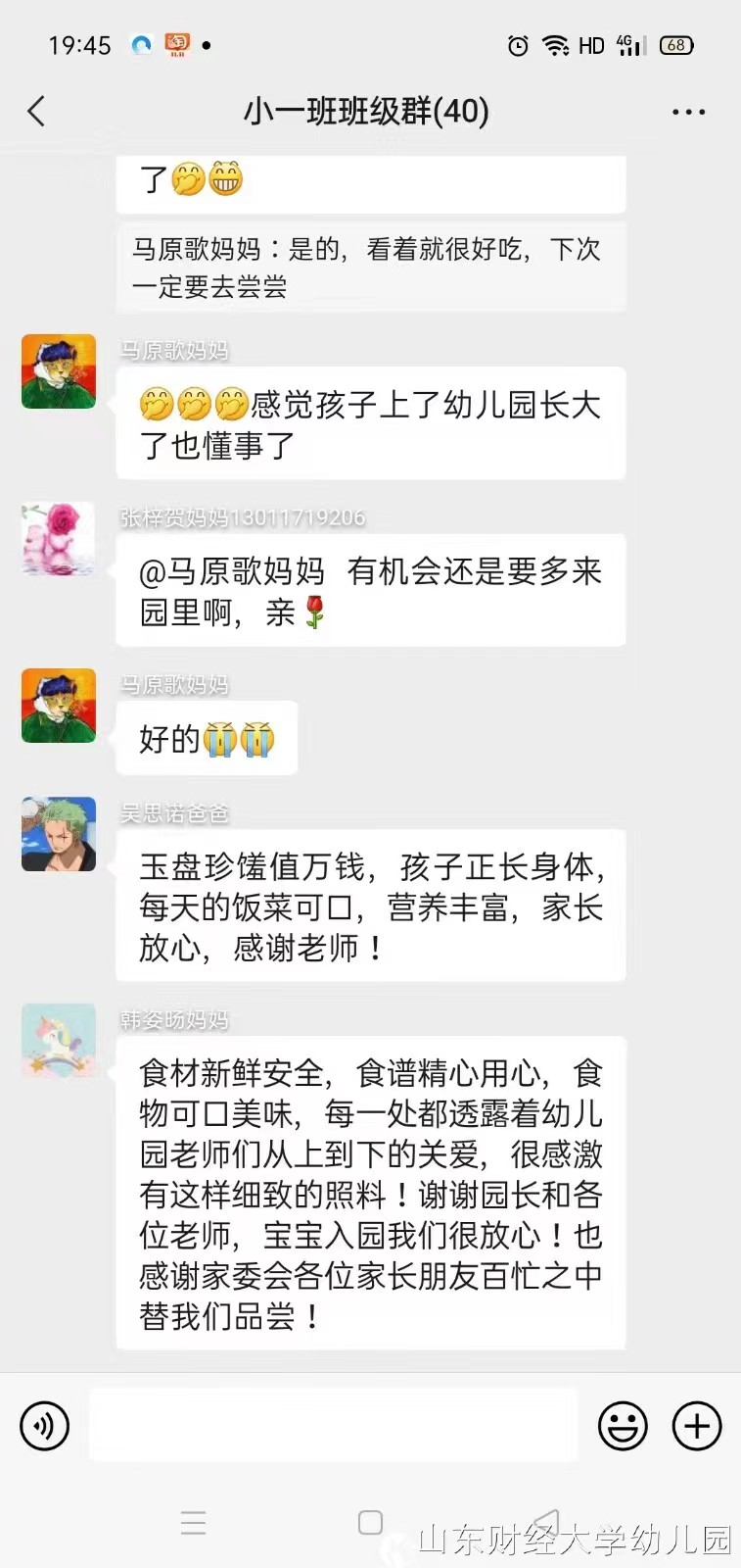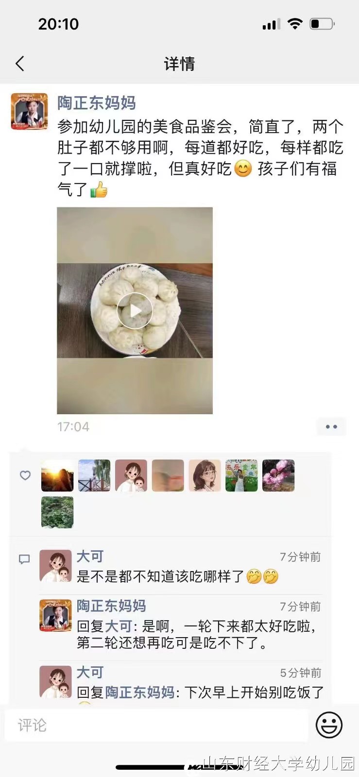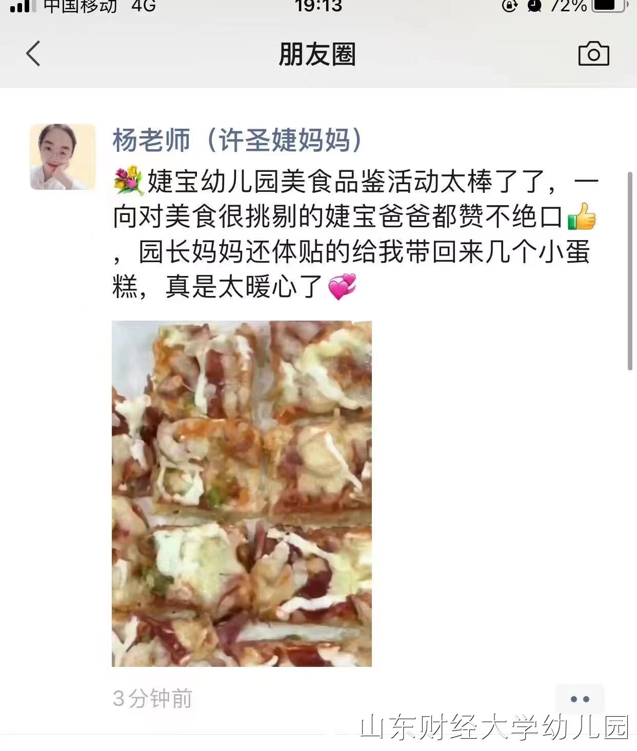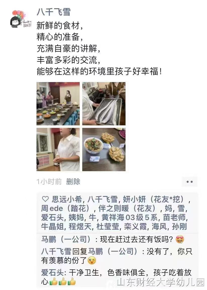 在热烈地掌声中,家委会成员请出了平时默默无闻、辛勤工作的食堂主厨,闫老师对今天品尝的各种美食逐一进行了介绍:从食材选购到加工制作,每个环节都按照“食品安全操作规范”进行,食材进货时都是三证齐全、都是要求最好最新鲜的,严格执行,保证孩子们在园入口的原材料都是安全可靠的。为了让孩子们爱吃、多吃、不挑食,经常创新食谱、变换花样,就是为了让孩子们在长身体的时候,各种营养都能吸收到、健康成长。