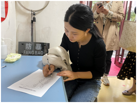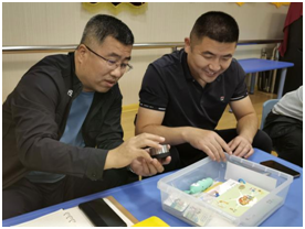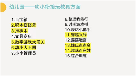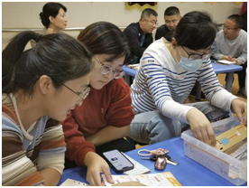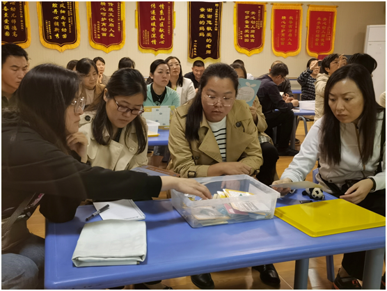 老师向家长介绍幼小衔接区域材料,邀请家长们尝试动手操作,了解孩子们在玩中学、学中玩,生活化、游戏化的学习方式。
