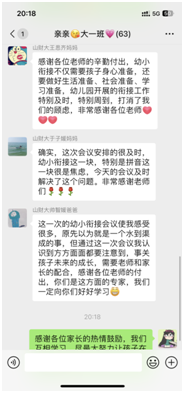 面对家长们对于幼小衔接的困惑,老师们结合本班实际情况,就幼儿园与小学的不同、入学前的准备,幼小衔接常规活动等方面与家长们深入交流,答疑解惑,缓解焦虑。