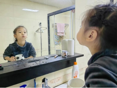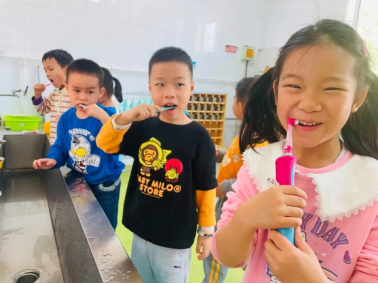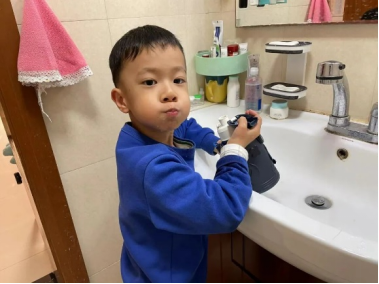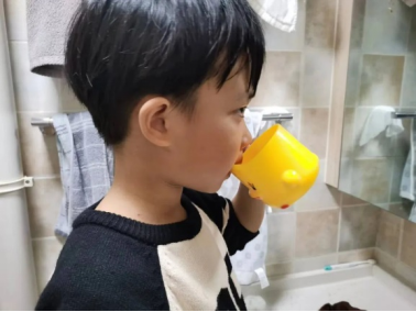 涂氟后,当天晚上不能刷牙哦!孩子们在家进行简单的牙齿残渣清理。