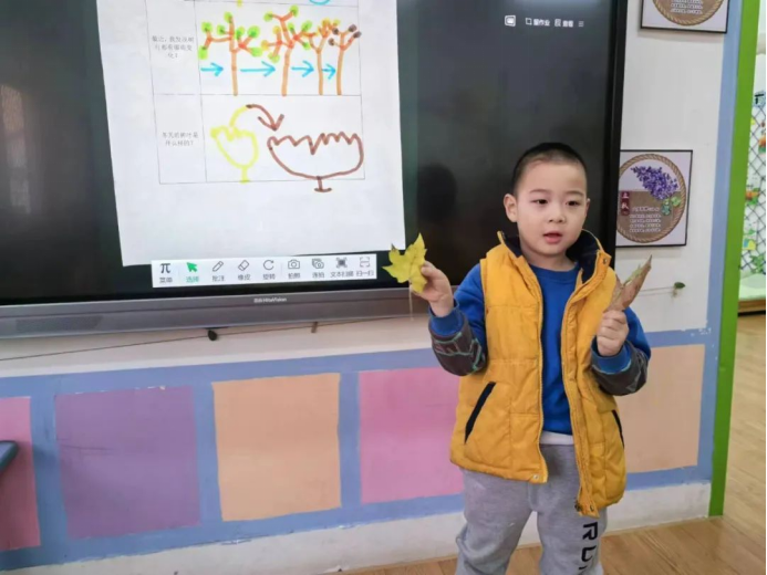 张子睿:树叶会从绿色慢慢地变成褐色,到了最后,大树的树枝都光秃秃的了,因为树叶都落到地上去了。