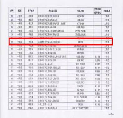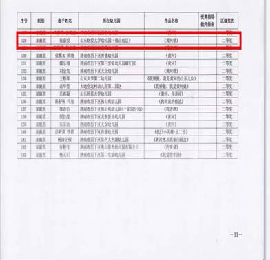 经各县(区、市)和省属幼儿园初赛,各市和学前、播音主持等领域专家进行专业评审,山东财经大学幼儿园(燕山校区)选送的作品中李佳胤小朋友小班组决赛作品《黄河》荣获二等奖;张嘉悦(已毕业),小朋友家庭组决赛作品《黄河颂》荣获二等奖。