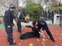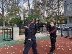随后,在民警的指导下,组织安保人员进行了防暴演练。演练过程中,一名“歹徒”手持凶器试图强行闯入幼儿园,安保人员迅速手持防暴盾牌和防暴钢叉等器械与“歹徒”对峙,最终成功将“歹徒”制服。