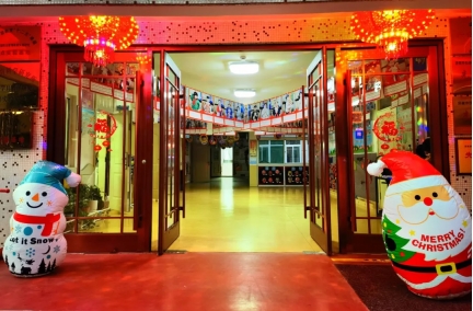 12月30日傍晚,幼儿园内张灯结彩,喜气洋洋,处处洋溢着节日的气氛。围墙四周彩灯闪烁,门前的雪娃娃、圣诞老人以及高高挂起的大红灯笼,让孩子们提前感受到新年的浓浓气息。