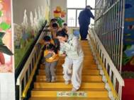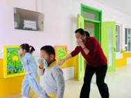 “着火啦,小朋友们不要慌,跟着老师,用湿毛巾捂住口鼻,弯腰快速撤离!”各班教师分工明确,有的在前方引导幼儿,有的在中途照顾幼儿,有的在后方确保没有幼儿掉队。