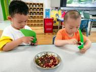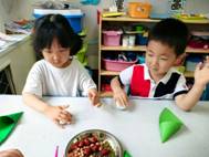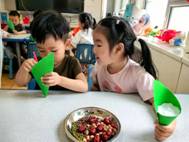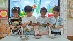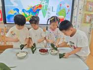 “淡淡粽叶香,浓浓粽香情”。折粽叶、填糯米、放馅料、裹粽叶、扎棉线。孩子们兴高采烈地包着属于自己独一无二的粽子。虽形态各异,但充满童趣。