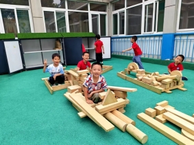 建构区变成了“军事基地”,孩子们用积木和玩具搭建坦克、大炮、狙击枪。在搭建过程中,不仅锻炼了动手能力,更在协作中深化了对阅兵装备的认知。