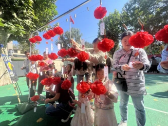 彩旗飘扬,笑语盈园,一双双小手牵着大手,穿梭在传统与现代交织的游戏场域中,感受着家国同庆的温暖与喜悦。