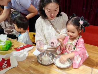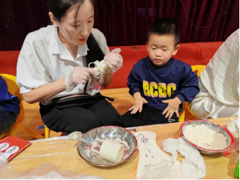 “制月饼”区域,在老师和家长的指导下,孩子们搓皮、包馅、压模,忙得不亦乐乎。一个个小巧精致的冰皮月饼在手中诞生,承载着劳动的喜悦与团圆的期盼。品尝着自己制作的月饼,甜蜜的滋味从舌尖直达心底。