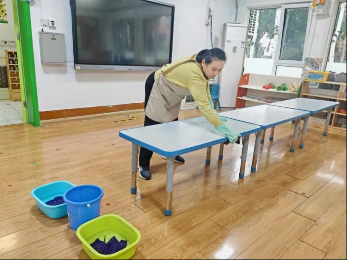 物体表面消毒:门窗把手、水龙头、玩具架、桌椅等高频接触处,每日用1:200配比的含氯消毒剂擦拭2次,作用10分钟后用清水擦净残留;塑料玩具浸泡消毒后晾干,毛绒玩具日光暴晒,确保每个玩具都干净安全。