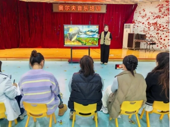 培训现场,奥尔夫音乐研发中心韩老师以"理论+实操"为核心,从奥尔夫音乐"生活化、游戏化"的本质出发,系统讲解了乐器运用、情境融合等教学关键点。老师们化身"快乐玩家",在拍手跺脚的节奏互动中感知韵律,在碰铃、响板等打击乐器的碰撞中探索音色,在集体律动、分组创编的游戏中解锁教学思路,真切感受到奥尔夫音乐的自由、快乐与创造魅力。