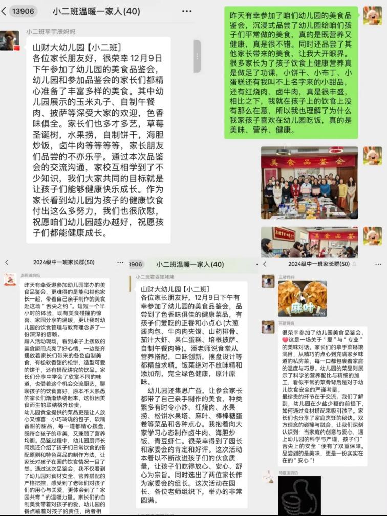 烟火暖人心,美味伴成长。山东财经大学幼教服务中心(燕山校区)、(舜耕校区)幼儿园分别于12月8日、9日下午3点温情开启美食品鉴会活动,食堂匠心呈味,家长携味赴约,家园共赴一场舌尖与心意交织的美好之约。