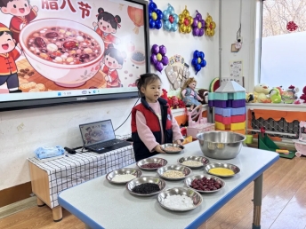 大一班的小朋友们用稚嫩的童声唱响《腊八歌》:“小孩小孩你别馋,过了腊八就是年”。清脆的歌声里,满是对新年的期待。
