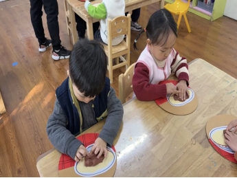 中一班的宝贝们用彩泥捏出一碗碗“腊八粥”,红豆、花生、莲子……各色食材栩栩如生。