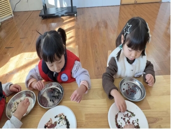 借助分豆的游戏形式,让小一班的宝贝们直观接触腊八节“备豆熬粥”的核心习俗,初步感知腊八节的传统文化内涵,建立对传统节日的认知与亲切感,萌发对中华民俗的喜爱。