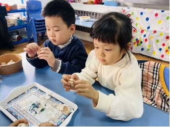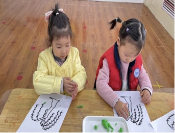 小一班宝贝们以粘土为笔,揉搓粘贴间,细致观察柳芽的嫩色与形态,在指尖创作中感知春季物候更迭,既锻炼手眼协调与精细动作,更让想象力随柳芽一同破土生长,解锁美术创作的满满乐趣。