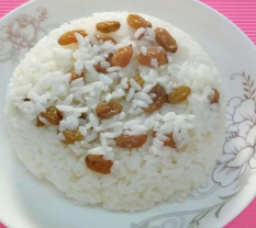 午餐:葡萄干米饭、锅包肉、爆炒有机菜花、八宝粥