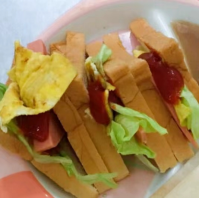 早餐:火腿三明治、煎鸡蛋、青菜瘦肉粥