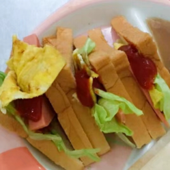 早餐:火腿三明治、煎鸡蛋、青菜瘦肉粥