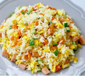 早餐:扬州炒饭、五香无抗鸡蛋、玉米糁粥