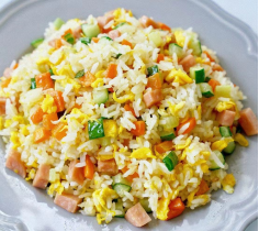 早餐:扬州炒饭、煮鸡蛋、黑芝麻核桃粥