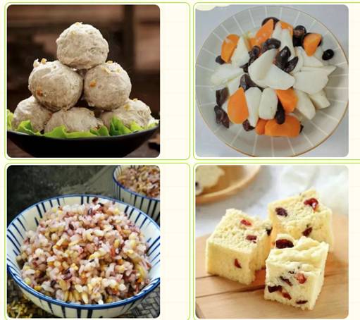 早餐 :煮鸡蛋、炒三丁、果脯发糕、花生山药糯米粥