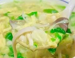 奶香馒头、软炸虾仁、肉末蘑菇奶白菜、西红柿鸡蛋汤