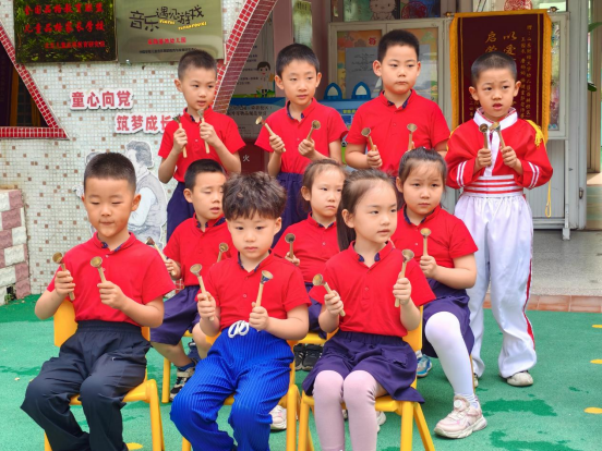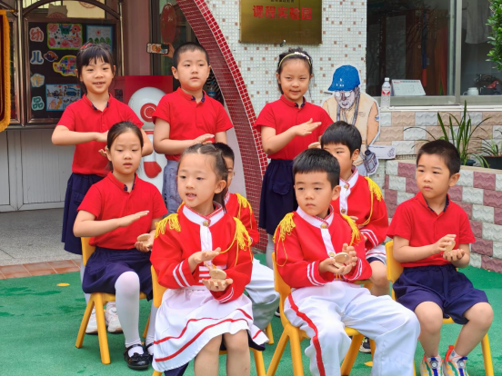在“国旗下风采展示”环节大一班小朋友为大家带来了精彩的奥尔夫打击乐表演《咯咯哒圆舞曲》。
