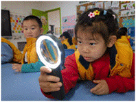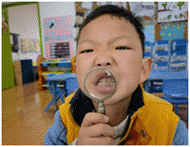 放大镜下我们的小牙是这样的啊,别动!让我看一下你有没有蛀牙。