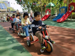 孩子们排队入园,户外活动时自觉遵守交通规则,快乐骑行。